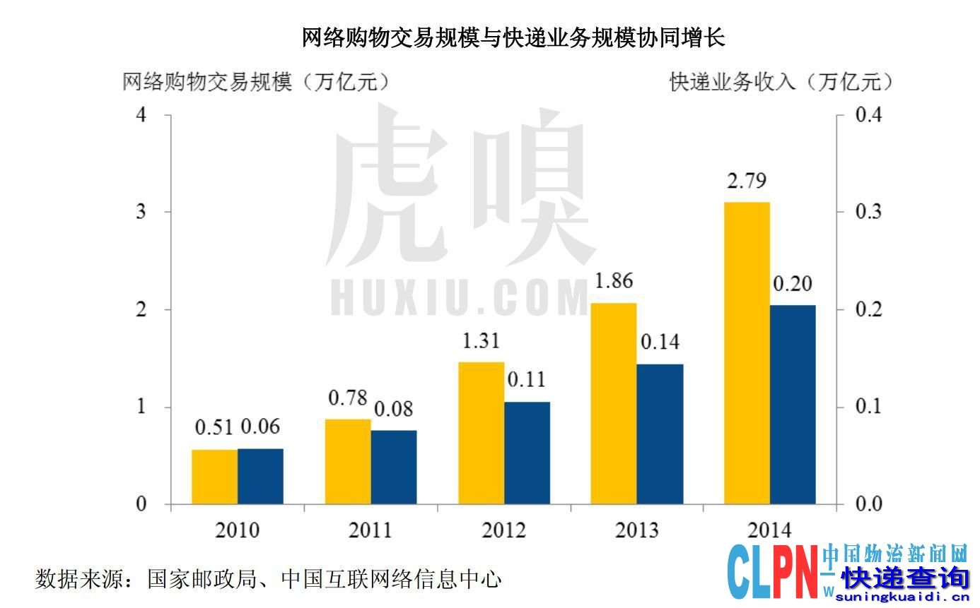 据国家邮政局数据,2008年至2015年间,快递总业务量年均复合增长率达45%。2015年配送206.7亿件(),总收入2769.6亿元()。异地、同城平均每单收费分别为10.19元和7.44元。